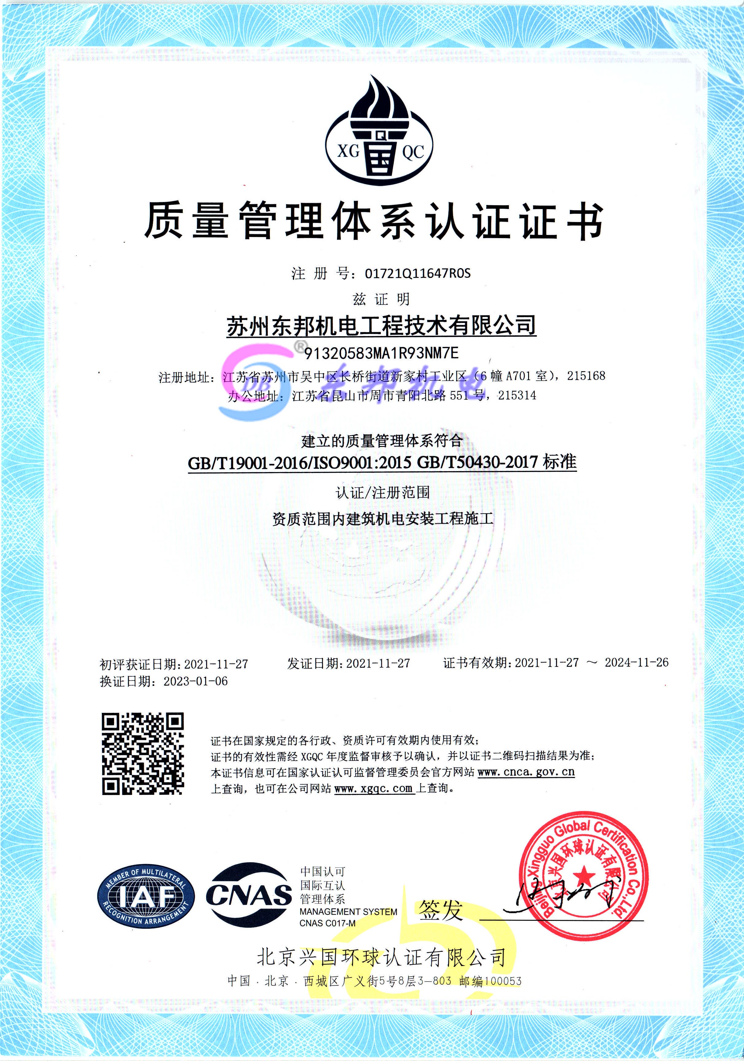质量管理体系认证证书