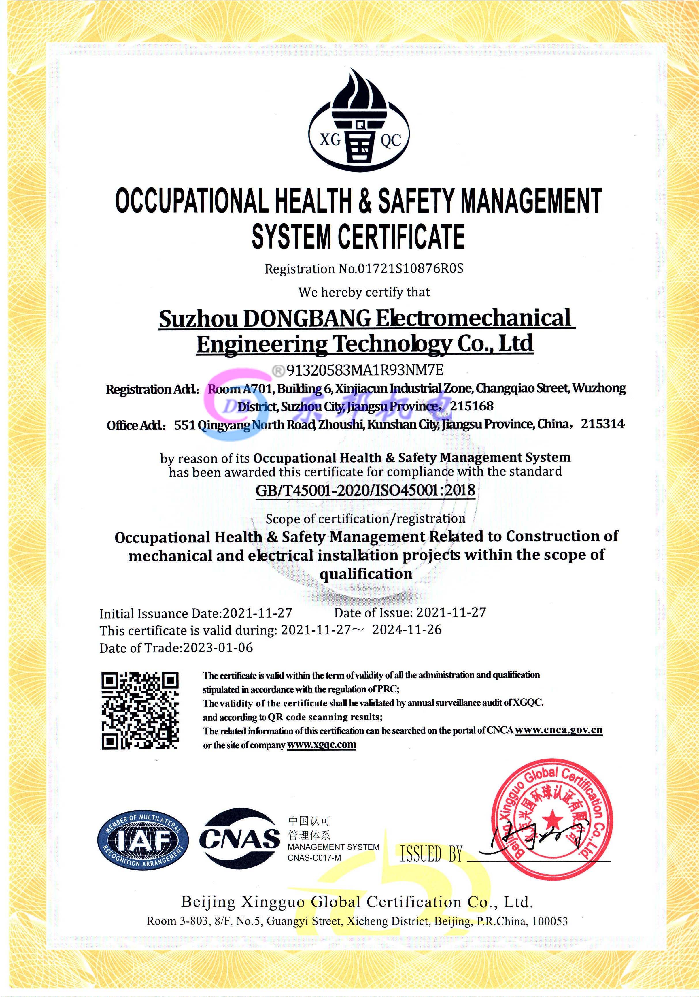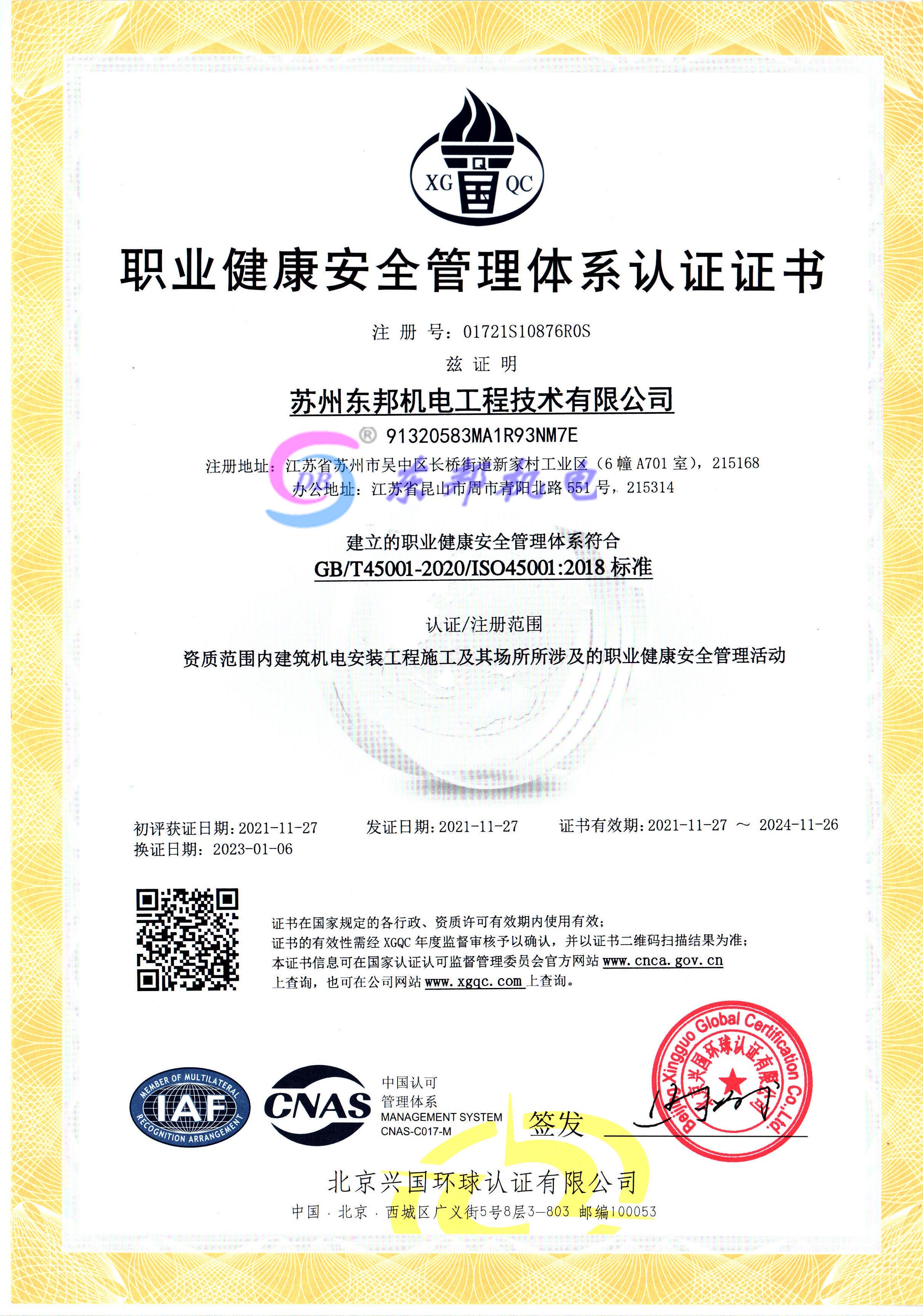 职业健康安全管理体系认证证书