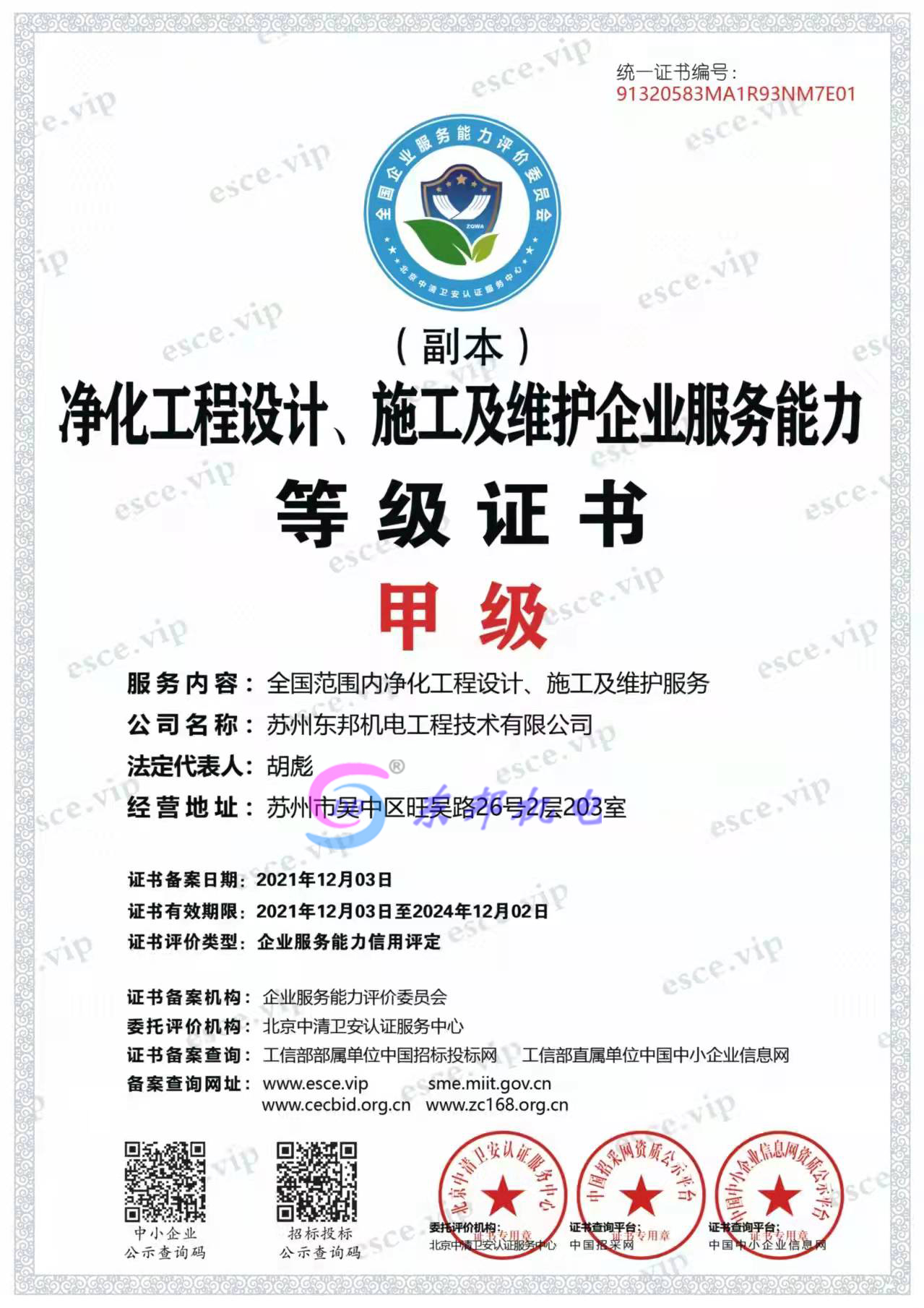 净化工程设计、施工及维护企业服务能力证书--甲级