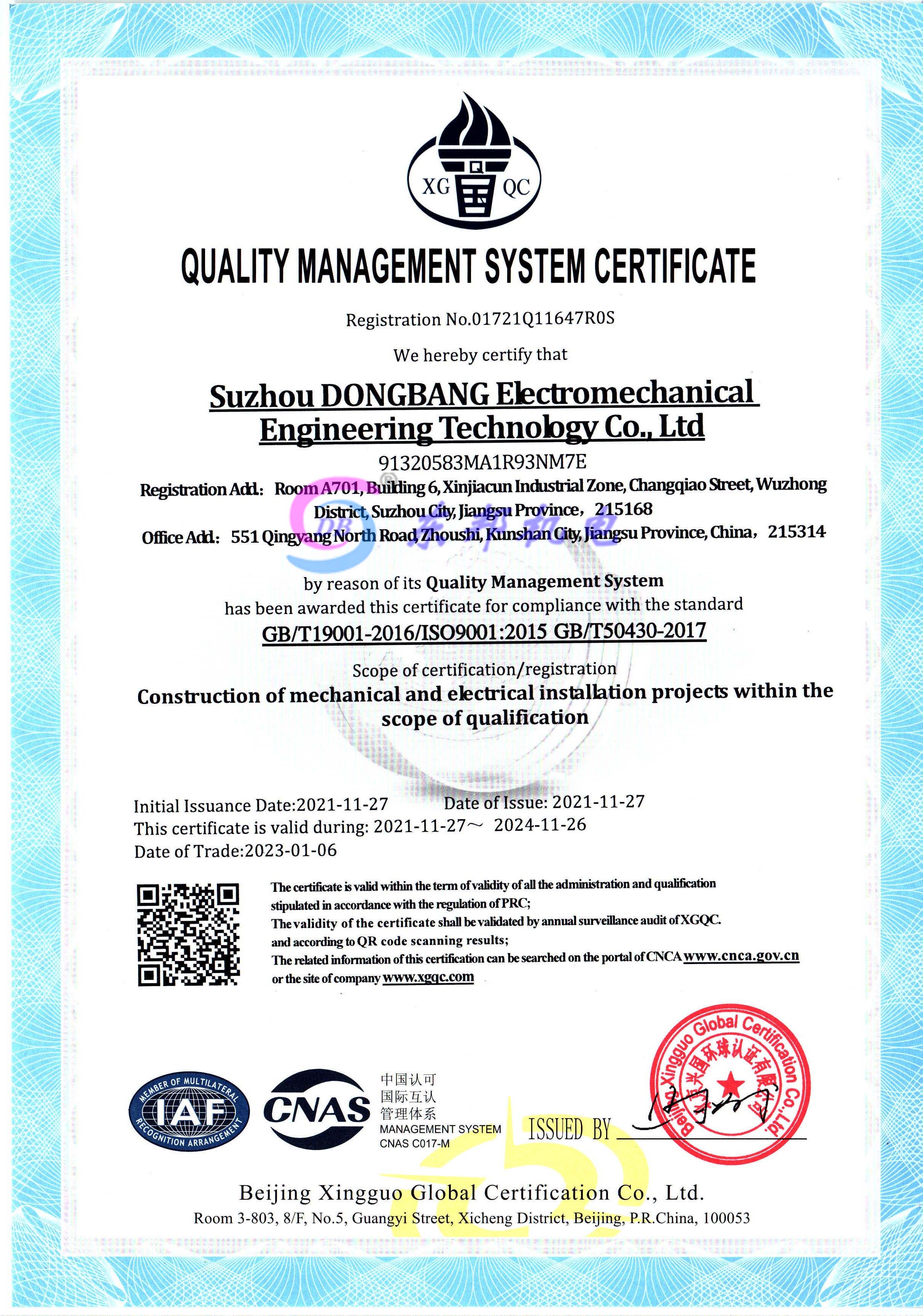 质量管理体系认证证书