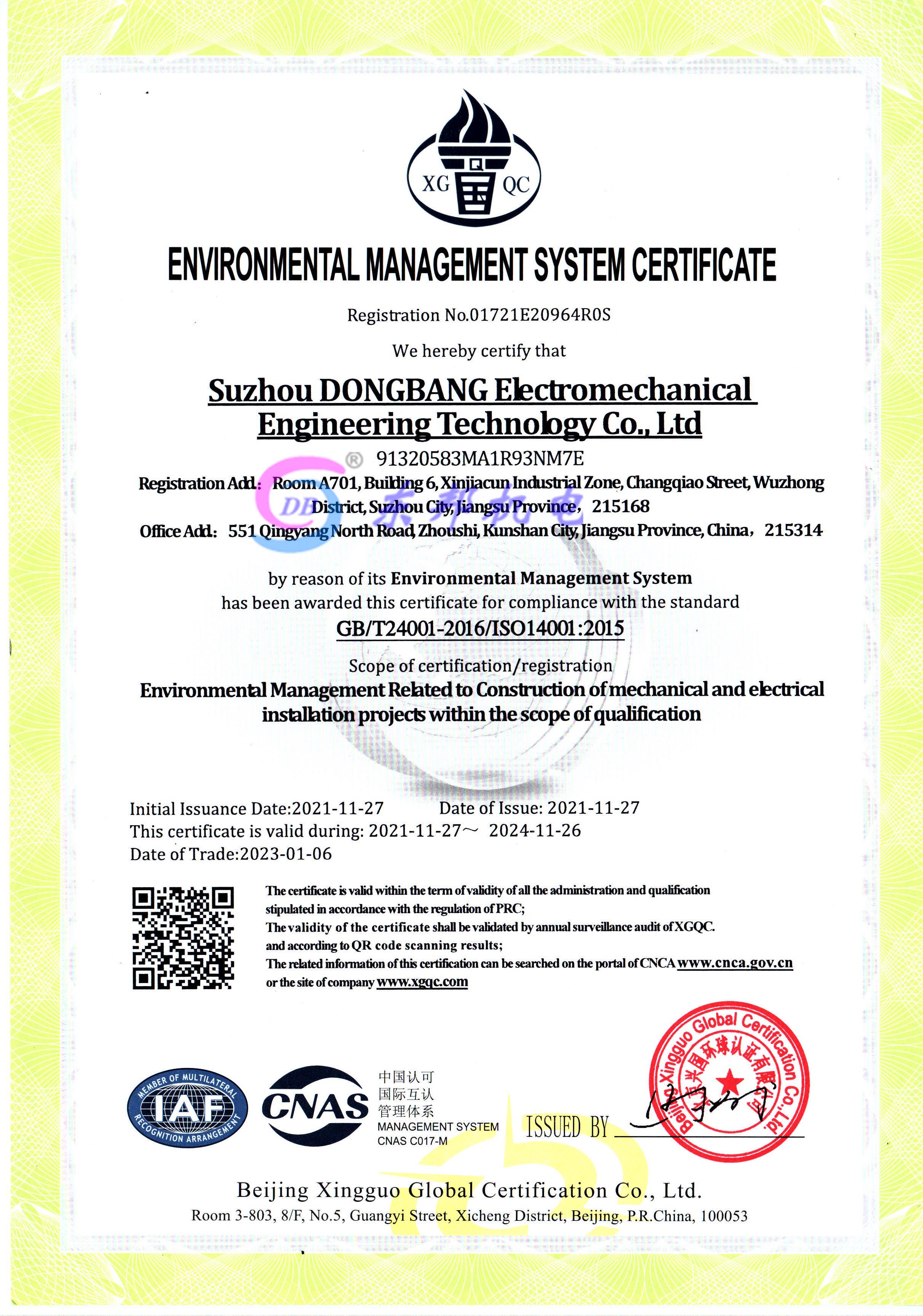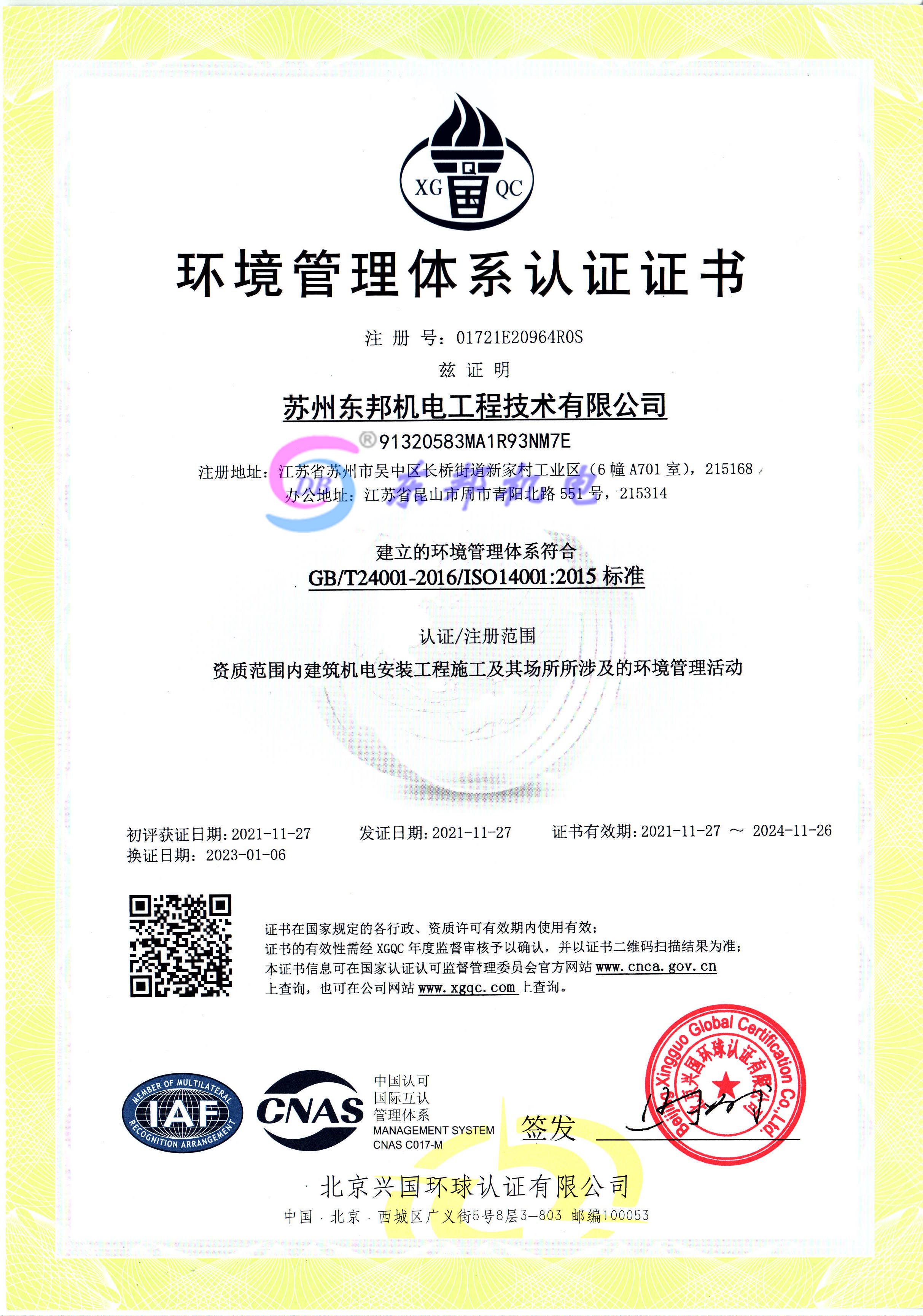 环境管理体系认证证书